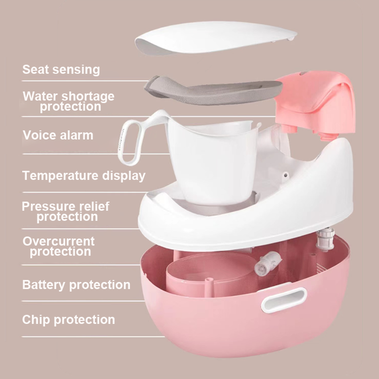 Functions:Â One touch control; Water temperature display; Warm night light; Seat cover slow down; Mobile power; Anti-slip foot pad; Whole machine spraying; High temperature protection; Voice alarm